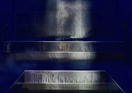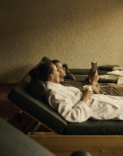 25 Meter Pool, 5 Saunen, verschiedene Ruheräume, Frischluft-Wiese. Perfekt für Beine hoch und Kopf auf Aus.