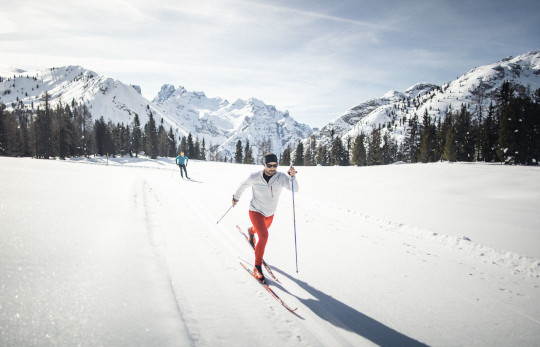 Es gibt viele wunderschöne Strecken – aber einige bleiben besonders in Erinnerung. Die Verbindung von Toblach nach Sexten ist leicht befahrbar und landschaftlich eindrucksvoll. Wer länger unterwegs sein möchte, kann sich auf den Weg Richtung Gsieser Tal machen – ein ruhiger, weiter Weg durch ein fast unberührtes Seitental. Auch die berühmte Toblach–Cortina-Loipe beginnt ganz in der Nähe. Sie zählt zu den Klassikern der Dolomiten und bietet nicht nur sportlichen Anspruch, sondern auch echtes Landschaftskino.