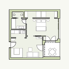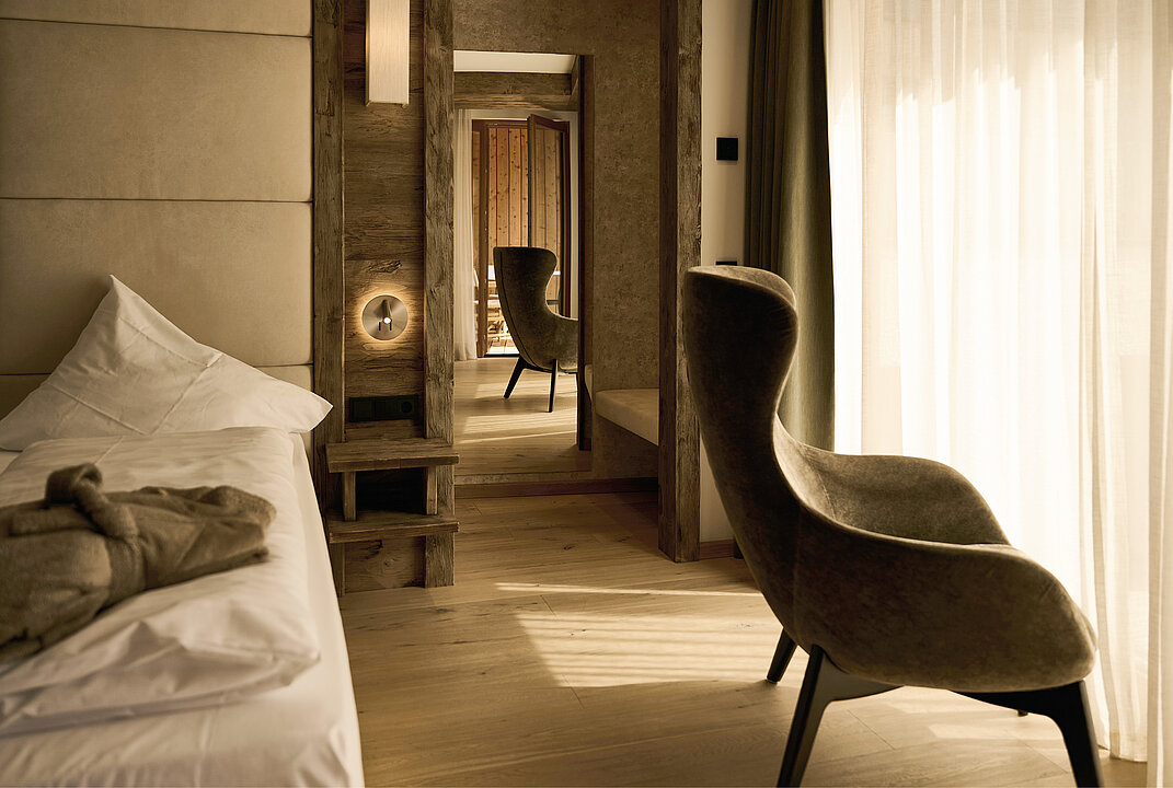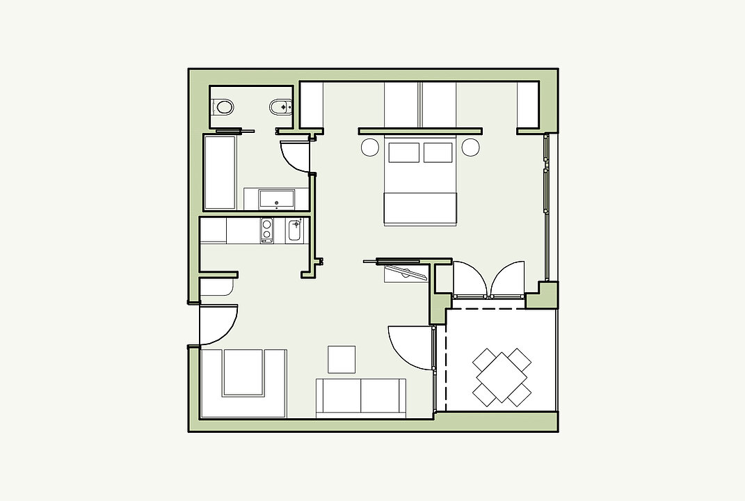 Ein gut durchdachter Grundriss für das richtige Gefühl von Urlaub. Großes Bad, Schlafzimmer mit begehbarem Schrank, Küche und Essbereich und dazu ein Chillbereich innen und einer draußen auf der privaten Loggia. Und diese kommt mit schöner Morgensonne und seitlichem Bergblick!