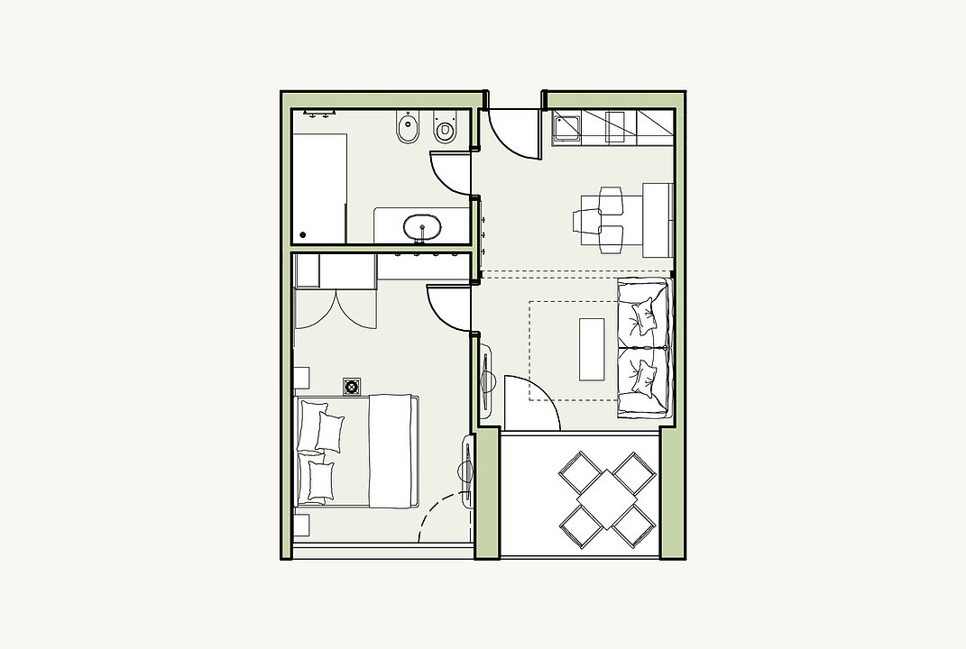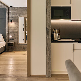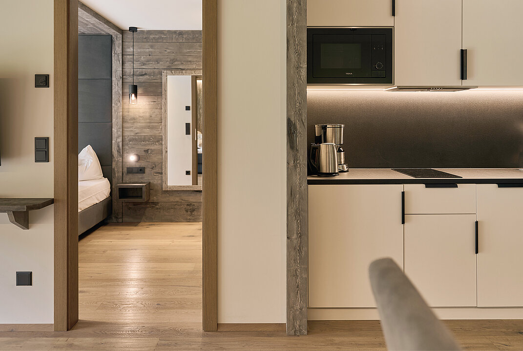 Modernes Apartment mit Doppelbett-Schlafzimmer, getrennter Wohnraum mit 43“ Flat-SAT-TV, orthopädischer Schlafcouch und hochwertig ausgestatteter Küchenzeile. Großes Bad mit Dusche und Bidet. Die gemütliche Loggia (7 m²) überzeugt mit Südausrichtung und traumhaftem Bergblick.