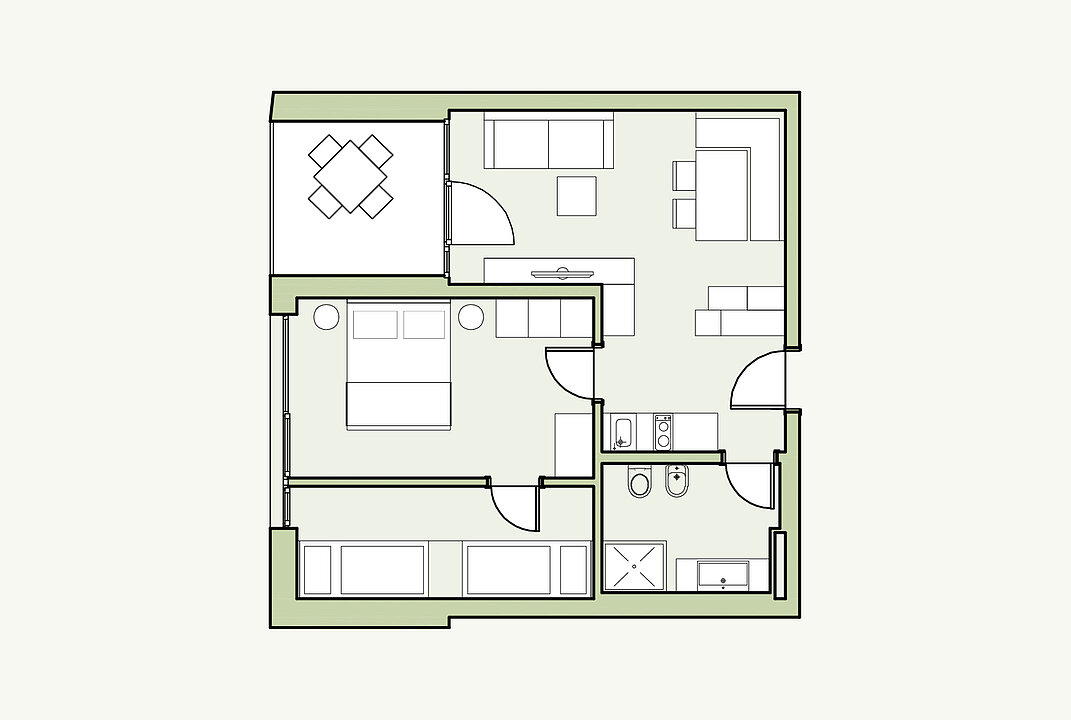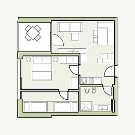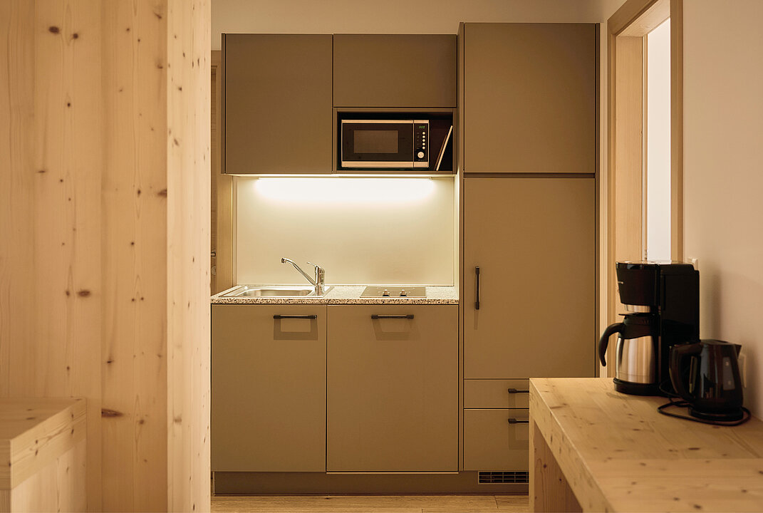 Hier wohnt es sich so richtig relaxed. Eigene Küche, freundlicher Wohnraum mit Sofa und eine private Loggia mit herrlicher Morgen- oder Abendsonne lassen jeden noch so perfekten Urlaubstag erst so richtig schön starten – oder ausklingen. Schlafzimmer, großes Bad und eigenes 2. Zimmer warten auf euch!