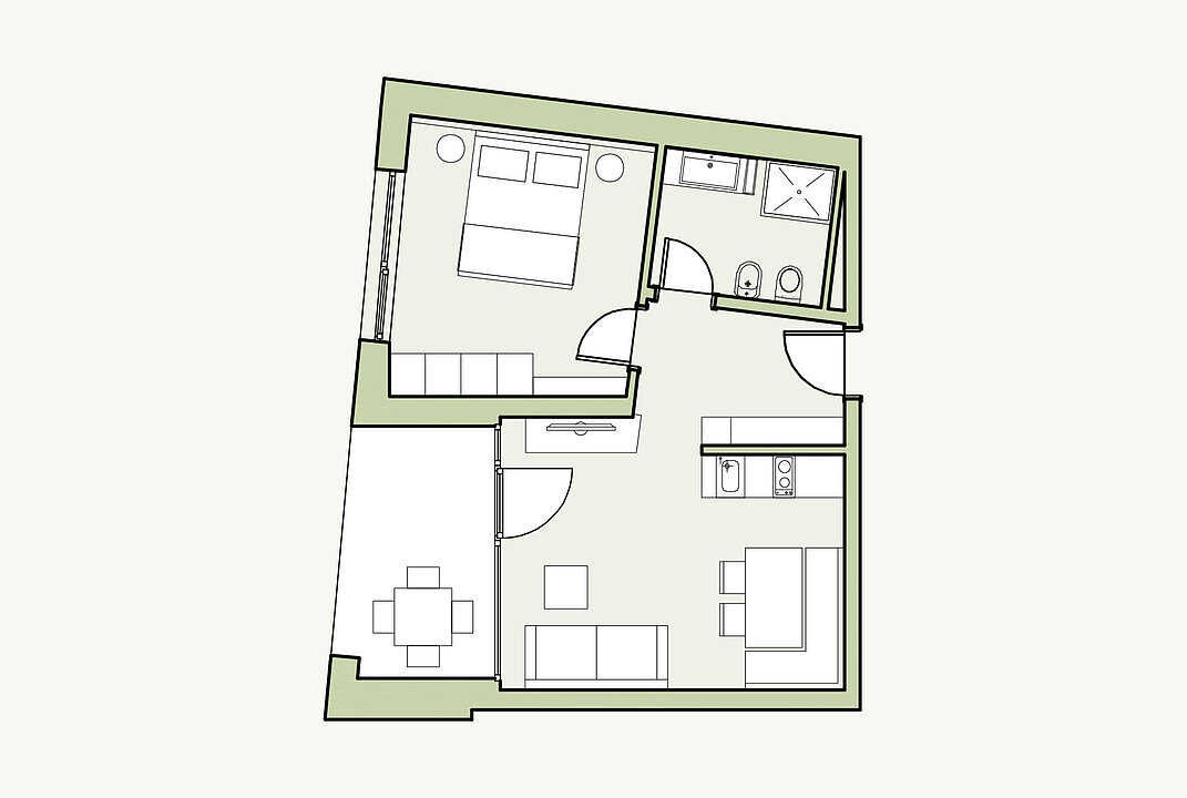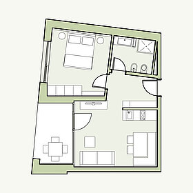 Die Natur als Mitbewohner: Ihr teilt euch die Küche, den schön-hellen Wohnraum mit Sofa, das Schlafzimmer und das großzügige Bad. Dazu als Highlight eure ganz private Loggia mit wunderbarer Abendsonne. So sollt doch eigentlich jeder Tag enden!