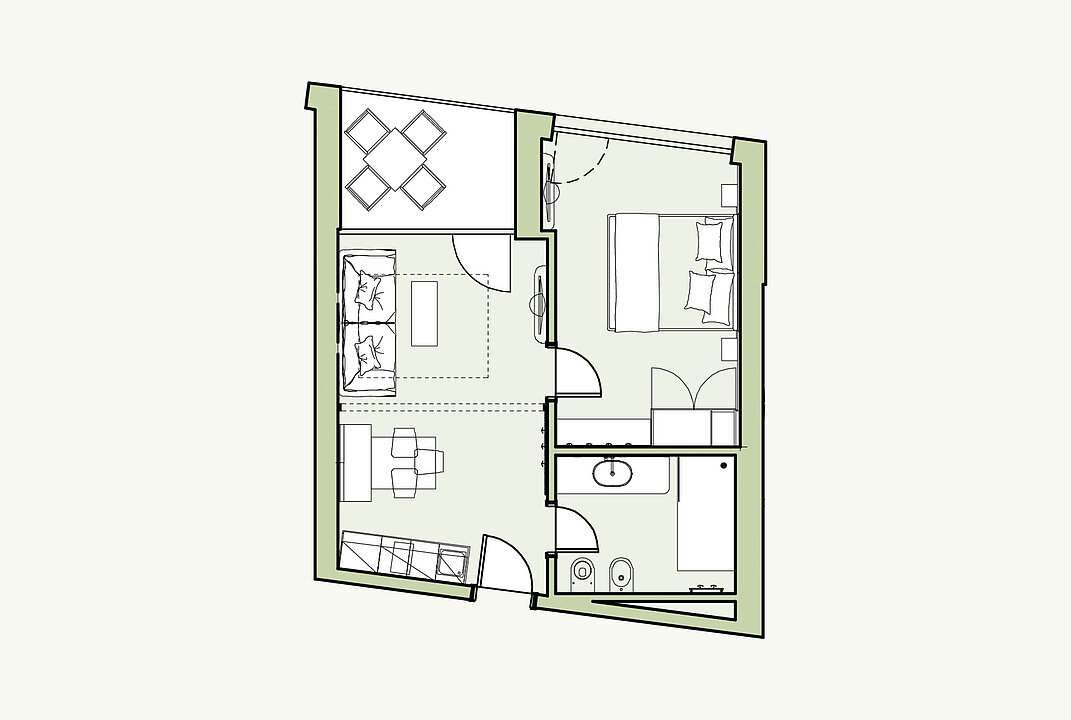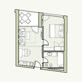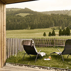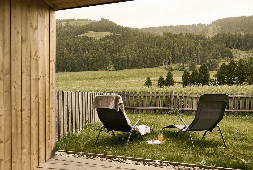 Entspannter Rückzug mit schönem Blick in Wald und Wiese. Ein Schlafzimmer, ein großes Bad und ein gemütlicher Wohnraum mit Küche, Esstisch und Chillsofa machen das kleine Glück perfekt, ganz zu schweigen von der privaten Loggia und den 40 m2 an eingezäunten, eigenem Garten.