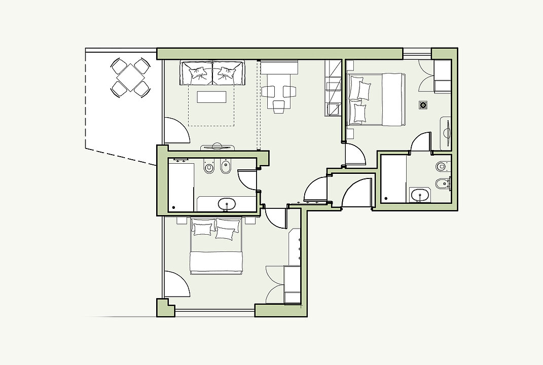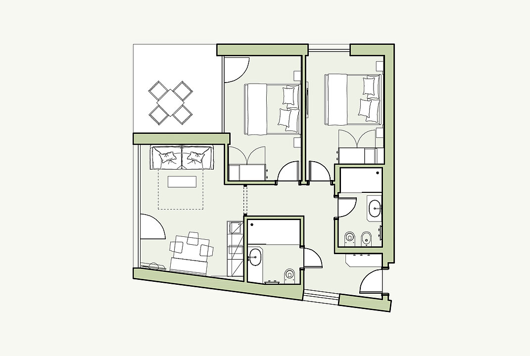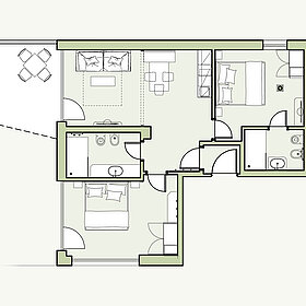 Modernes Apartment mit zwei Doppelbett-Schlafzimmern, getrennter Wohnraum mit 43“ Flat-SAT-TV, orthopädischer Schlafcouch und hochwertig ausgestatteter Küchenzeile. Zwei Bäder mit Dusche und Bidet. Die gemütliche Loggia (7 m²) mit Sonnenliegen und der eingezäunte Privatgarten oder Terrassen laden zum Entspannen ein.